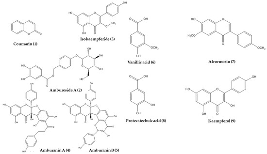 In the phytochemical analysis of the ethanolic extract of the bark of A. cearensis performed by Canuto and Silveira [33], the presence of several compounds was identified, such as coumarin; the phenolic acids vanillic acid and protocatechuic acid; flavonoids afrormosin, isokaempferide, kaempferol, quercetin, and 4′-methoxy-phiseti; and the phenolic glycoside amburoside A and a mixture of glycosylated β-sitosterol and stigmasterol. Canuto et al. [34] identified amburoside A and six new amburosides (C-H): 6-coumaryl protocatechuate, 6-hydroxycoumarin, isokaempferide, formononetin, vanillic acid, and (E)-o-coumaric acid. Leal et al. [35] also identified protocatechuic and vanillic acids in addition to coumarin and amburoside A. Sá et al. [36] showed the presence of 4-methoxy-3-methylphenol and tricyclene as well as the terpenoids α-pinene, β-pinene, and 4-hydroxybenzoic acid.