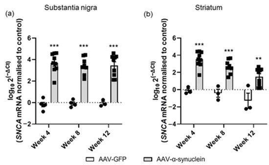 qRT-PCR analyses of human α-synuclein mRNA in the nigrostriatal pathway. The administration of AAV-α-synuclein induced a significant upregulation of human α-synuclein mRNA in (a) the substantia nigra and (b) in the striatum across all time-points. Data are represented as mean ± SEM with 3–9 animals per group. ** p < 0.01, *** p < 0.001 vs. AAV-GFP by two-way ANOVA with post hoc Tukey.