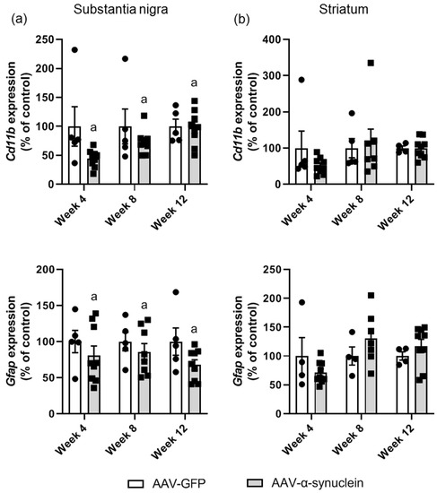 qRT-PCR analyses of astrocytic and microglial markers in the nigrostriatal pathway. In (a) the substantia nigra, AAV-α-synuclein administration led to an overall reduction in the expression of the microglial marker Cd11b and the astrocytic marker Gfap. (b) There were no differences between groups in the striatum. Data are represented as mean ± SEM with 4–9 animals per group by two-way ANOVA with post hoc Tukey. ‘a’ indicates an overall group effect.