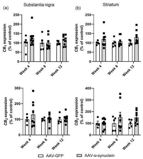 2.4. AAV-α-Synuclein Did Not Alter CB1 or CB2 Receptor Expression in the Nigrostriatal Pathway