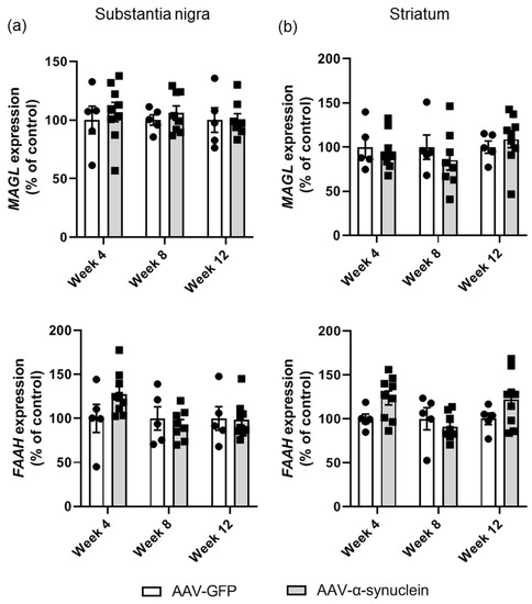 qRT-PCR analyses of the expression of endocannabinoid degrading enzymes in the nigrostriatal pathway. Administration of AAV-α-synuclein did not induce alterations in the expression of MAGL or FAAH in (a) the substantia nigra or (b) the striatum. Data are represented as mean ± SEM with 5–9 animals per group by two-way ANOVA.