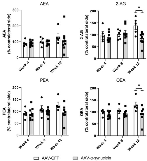 LC-MS/MS measurements of striatal endocannabinoid levels. Unilateral intranigral AAV-α-synuclein did not alter striatal AEA or PEA levels but induced a reduction in the levels of 2-AG and OEA at Week 12. Data are analysed as mean ± SEM with 5–9 animals per group. * p < 0.05 vs. corresponding AAV-GFP group by two-way ANOVA with post hoc Tukey.