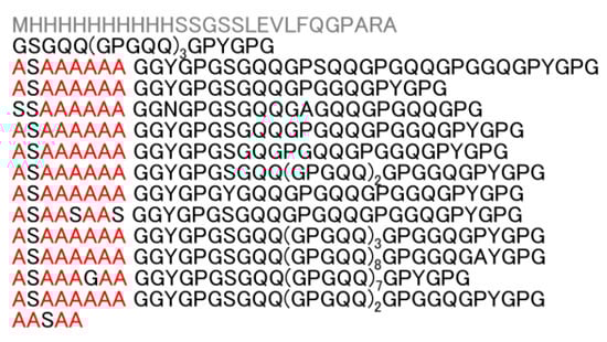 RSP, with the amino acid sequence encoded by the ADF-3 fibroin gene of A. diadematus, was produced using Escherichia coli and purified using a Ni column [47]. A His-tag was attached to the N-terminus of the amino acid sequence for sample purification. Uniformly labeled (13C, 15N) RSP was also produced by using M9 minimal medium containing (2 g/L) 13C-glucose and (1 g/L) 15N-ammonium. Figure 1 shows the amino acid sequence of RSP.