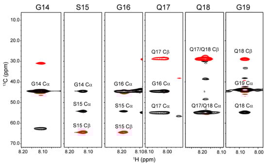The strip plots of the 3D triple resonance HNCACB spectrum of U-[13C,15N] labeled RSP in FA collected at 298 K, 600 MHz. Selected 15N planes with 1H-13C correlations are displayed with antiphased 13Cα (black) and 13Cβ (red) cross-peaks from the corresponding amino acids and previous amino acids.