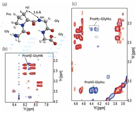 (a) Structural model of Gly-Pro-Gly-Gly motif formed typical type II β-turn structure; (b) superimposed spectra of 1H-1H NOESY (blue) and 1H-1H TOCSY (red) for RSP dissolved in FA. The NOESY cross-peaks between ProHβ and GlyHN whose distance is 3.6 Å illustrated in (a) are denoted. (c) Superimposed spectra of 1H-1H NOESY (blue) and 1H-1H TOCSY (red) for RSP dissolved in FA. The NOESY cross-peaks between GlyHα-ProHδ and GlyHα-ProHγ are denoted.