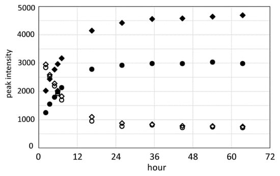 The plot of peak intensity for the CαH and CβH2 protons of unformylated and formylated Ser residues over time after the dissolution of RSP in FA. (● formylated Hα, ◆ formylated Hβ, ○ unformylated Hα, ◇ unformylated Hβ).