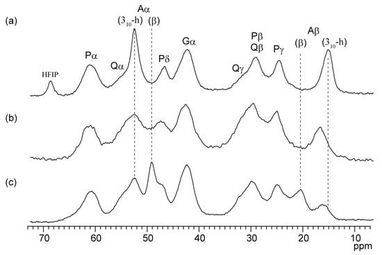 13C CPMAS NMR spectra of RSP films prepared using different solvents: (a) HFIP, (b) DMSO, and (c) FA with peak assignments. Ala Cα and Cβ are assigned secondary structures of a 310-helix (310-h) and a β-sheet (β), respectively.