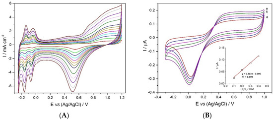 Electrochemical behavior of the CMF/Pt in acidic and neutral electrolyte media. (A) Successive cyclic voltammograms (25th scan) at increasing scan rates (50–1000 mV s−1) obtained in deoxygenated H2SO4 (0.5 M); (B) Cyclic voltammograms between −0.3 and + 1.0 V vs. Ag/AgCl obtained with a CFM/Pt in deoxygenated phosphate-buffered solution (0.05 M, pH 7.4) at a scan rate of 0.05 V s−1 in the absence (a) and presence of increasing concentrations of H2O2 (b–e); 0.1–0.4 mM); Inset: plot of anodic (Ipa) peak currents (at +0.7 V) as a function of H2O2 concentration, showing the respective linear regression equation.