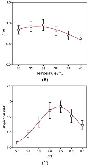 Considering that subtle changes in temperature and pH can occur in the brain extracellular space [52,53,54], and that these directly affect enzyme activity, these parameters were evaluated to fully characterize the lactate microbiosensor.