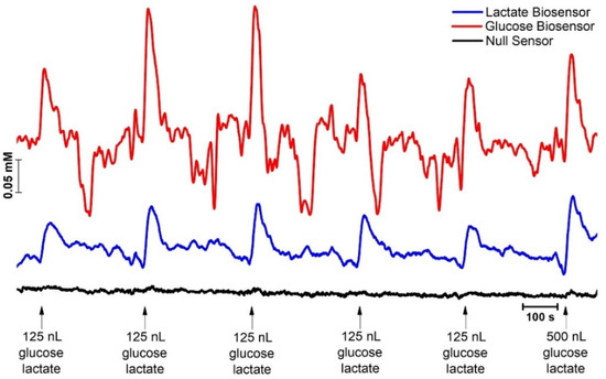 The preferential utilization of glucose or lactate under resting conditions and neuronal activation has been a matter of debate due to inconsistent results obtained in different experimental models and conditions [6]. Difficulties can, in part, be attributed to the heterogeneous nature of the cellular organization of the brain and the limited spatial and temporal resolution of the analytical techniques that have been more frequently used to study neurometabolism. Therefore, there is a need for developing reliable and robust biosensors tools for monitoring rapid and transient neurochemical changes, including the trafficking of lactate and glucose in the brain extracellular fluid at resting and following neuronal activation. When compared to current standard techniques, such as noninvasive PET or invasive brain microdialysis, the use of biosensors based on microelectrodes coupled to high speed electrochemical techniques offers important advantages regarding spatial, temporal, and chemical resolutions [7,8,9,10,11].