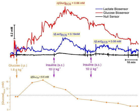 As can be observed in the representative recording shown in Figure 6, glucose administration induced a rapid increase in blood glucose levels (maximum increase of 9.5 mM, 25 min) which was followed by an increase in the brain glucose concentration (maximum increase of 0.66 mM, 40 min). We hypothesize that, the increase in brain glucose concentration was the result of transport across the blood–brain barrier (BBB) by type 1 glucose transporters (GLUT1) in a facilitated diffusion mechanism [58] that is insensitive to insulin, and conveys about 50 times more glucose into the central nervous system than would otherwise enter [59]. Despite the increase in the brain glucose levels, no change in lactate was observed during this hyperglycemic phase. Following insulin administration, blood glucose concentration decreased continuously throughout the remainder of the recording, falling below initial baseline values. In brain tissue, the decrease in glucose was slower than that observed for blood and remained above baseline values. The effect of insulin administration on blood and brain extracellular glucose concentration was in agreement with other studies carried out with microbiosensors [57,60,61,62,63].