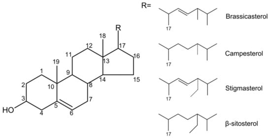 - Valitova, J.N.; Sulkarnayeva, A.G.; Minibayeva, F.V. Plant Sterols: Diversity, Biosynthesis, and Physiological Functions. Biochemistry 2016, 81, 819–834. [Google Scholar] [CrossRef]