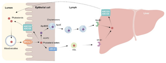 The bioavailability of phytosterols depends on many factors, including some intestinal transporters, their different molecular types, and genetic factors. Phytosterols and cholesterol have similar chemical structures, but the intestinal absorption rate of phytosterol is much less than that of cholesterol. Only less than 5% of phytosterols can be absorbed [24], while cholesterol can be absorbed at 50–60% [25]. Phytosterols follow food into the digestive tract, bind to the sterol transporter Niemann-pick C1-like 1 (NPC1L1) located in the apical membrane of intestinal cells in the intestinal lumen (Figure 2), and are then absorbed by intestinal epithelial cells [26]. However, free phytosterols are excreted into the intestinal lumen by ATP binding cassette (ABC) G5/8 in the intestinal cells. There are a small number of phytosterol molecules that can circumvent this mechanism and are then carried into the circulation by lipoproteins. The quantity distribution of the lipoproteins is similar to that of cholesterol, so that most of the phytosterol molecules circulate in LDL particles (70–80%). Another process of phytosterol metabolism is to combine with the ABCA1 transporter in the basolateral membrane of intestinal cells and mobilize to become part of HDL particles. After being transported to the liver, phytosterols can also be transported back to the intestine by ABCG5/8 protein at the hepatobiliary interface [27].