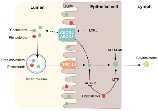 Phytosterols inhibit cholesterol absorption. Cholesterol and phytosterols have similar chemical structures, and thus have similar metabolic mechanisms. Apolipoprotein B48 (APO-B48) and microsomal triglyceride transfer protein (MTP) can incorporate cholesterol esters into chylomicron. ABCG5 and ABCG8 genes may be upregulated by Liver X receptor α (LXRα) in a high cholesterol environment. Phytosterols compete with cholesterol in micelles in the intestinal lumen and brush border membrane (BBM), thereby reducing cholesterol absorption. By affecting the expression of ACAT2 and MTP, the cholesterol esterification and the amount of cholesterol entering chylomicron were reduced.