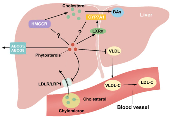 Phytosterols regulate hepatic cholesterol metabolism. Cholesterol in the remnants of chylomicron enters the liver through the action of LDLR and LRP1, which is effectively inhibited by PS. The specific mechanism of phytosterol regulation of HMGCR, a key rate-limiting enzyme for cholesterol synthesis, is unclear. Cholesterol is converted to BAs in the liver by CYP7A1, and LXRα is an upstream regulatory gene of CYP7A1. PS can promote LXRα expression, but the regulatory role for CYP7A1 is controversial. VLDL produced by the liver can be converted to LDL-C in the blood vessels, and PS can decrease hepatic VLDL production to reduce circulating LDL-C levels. PS can also be secreted into the bile via ABCG5/8.