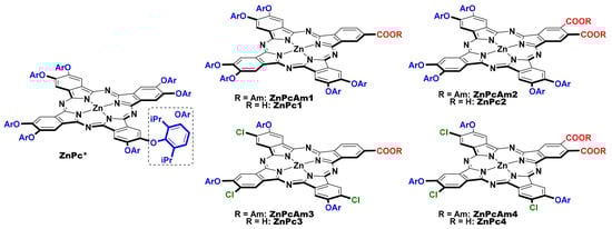 The structures of symmetrical reference complex ZnPc* and A3B-type zinc phthalocyaninates ZnPc1–4 synthesized in this work. The amyl esters ZnPcAm1–4 were obtained as intermediates in the synthesis of the corresponding ZnPc1–4.