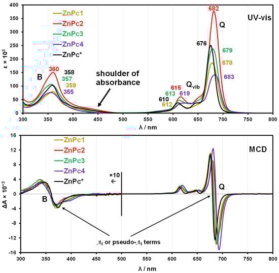 UV-visible absorption and magnetic circular dichroism (MCD) spectra of the zinc phthalocyaninates in dimethylformamide. MCD spectra were measured for solutions with a fixed Q00 band absorbance of 1.4.