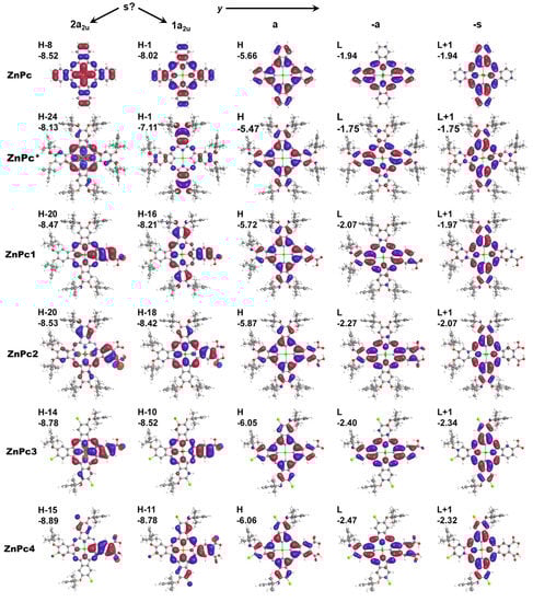 Nodal structure and energies (eV) of frontier orbitals in ZnPc* and ZnPc1–4 according to CAM-B3LYP/6-31G(d) calculations.