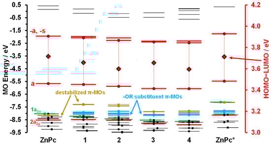 Molecular orbital (MO) energies of ZnPc, ZnPc* and ZnPc1–4. The a, s (2a2u), -a and -s MOs are highlighted in red with circles used to denote the a and -a MOs, while green is used to highlight MOs derived from the 1a2u MO of ZnPc. The occupied MOs are highlighted with small squares. MOs localized on the sterically demanding -OR substituents are highlighted in light blue, while amber is used for π-MOs localized on the peripheral benzo rings that are destabilized. Red diamonds are used to highlight the highest occupied molecular orbital−lowest unoccupied molecular orbital (HOMO−LUMO) gap values and are plotted against a secondary axis. σ-MOs associated with the aza-nitrogen lone pairs are offset to the right.