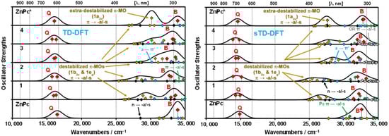 The effect of introducing the peripheral substituents was analyzed through a comparison of the experimental spectral data with the TD-DFT and sTD-DFT calculations. In contrast to previous studies of substituted phthalocyanines where bulky alkoxy and aryloxy groups were truncated and replaced with methoxy groups to save computational time [22,23,24,25], in the present work, all calculations were performed for molecules with genuine diisopropylphenoxy substituents to further demonstrate the capabilities of the sTD-DFT approach in the context of a desktop computer.