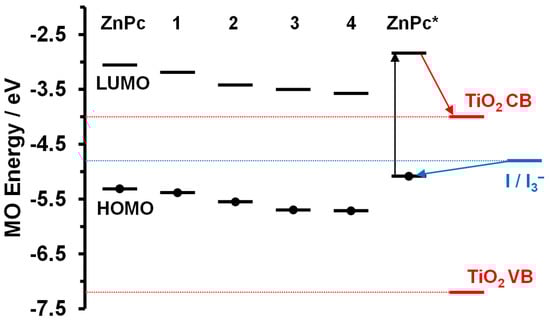 HOMO and LUMO energies for the B3LYP optimized geometries of ZnPc, ZnPc* and ZnPc1–4 at the B3LYP/SDD level of theory are plotted as black horizontal lines. Circles are used to highlight the HOMO in each case. Red lines are used to highlight the conduction band (CB) and valence band (VB) of TiO2, while a blue line is used for the redox potential of the I/I3− electrolyte [46,50]. Black, red and blue arrows are used to highlight the photoexcitation of the dye, injection of an electron into the TiO2 CB, and regeneration of the dye, respectively, in the context of ZnPc*.