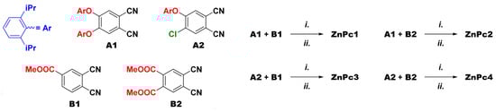 Synthesis of zinc phthalocyaninates ZnPc1–4: i.—Zn(OAc)2, 1,8-diazabicyclo[5.4.0]undec-7-ene, n-pentanol; ii.—NaOH, H2O, tetrahydrofuran, MeOH.