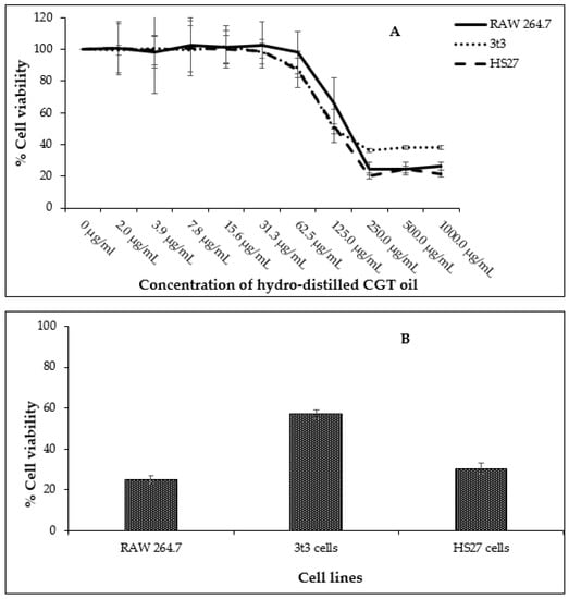 Cell viability of RAW 264.7, HS27, and 3t3 cells (n = 3) exposed to different concentrations of CGT oil (1:2 dilution) for 24 h (A) and cell viability recorded against the positive control chlorambucil (B, at 1 mg/mL). Percentage cell viability is represented as mean ± SD.