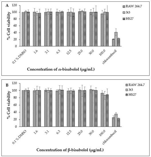 Cell viability observed for RAW 264.7, 3t3 and HS27 cells (n = 3) exposed to α-bisabolol (A) and β-bisabolol (B) concentrations for 24 h against the positive control chlorambucil (1 mg/mL). Percentage cell viability is represented as mean ±SD.