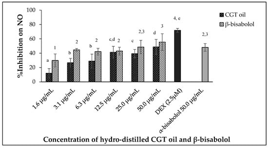 CGT oil and β-bisabolol significantly regulated the production of nitric oxide by the macrophages in a dose-dependent manner (Figure 3) after 24 h of exposure (p < 0.05). The effectiveness of CGT oil to regulate the production of NO was such that there was an observed reduction of 12.0% at the lowest concentration of the oil (1.6 µg/mL). At the maximum concentration of CGT oil (50.0 µg/mL), NO was inhibited by 48.8% compared to 71.9% NO inhibition induced by 2.5 µM of the anti-inflammatory drug, dexamethasone (DEX).