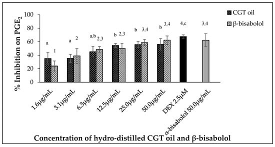 Leukemic macrophages (RAW 264.7) used in this study were able to release PGE2 when stimulated by 100 ng/mL LPS. Oil extracted from CGT reduced the production of PGE2 in a dose-dependent manner (p < 0.05) (Figure 4). The same concentration-dependent response was also observed for β-bisabolol (Figure 4) as 1.6 µg/mL reduced PGE2 production by 24.0% and 50.0 µg/mL by 62.3%.