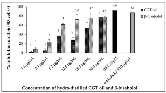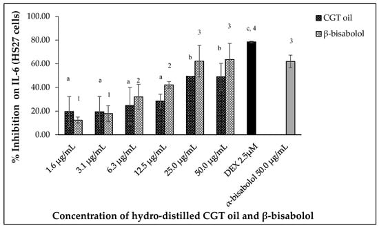 Effect of CGT oil and β-bisabolol dilutions on IL-6 production in HS27 cells. HS27 cells were exposed to test extracts or compounds for 1 h and then induced with 100 ng/mL lipopolysaccharide (LPS) for IL-6 production (n = 3). Values are expressed as mean ± SD. Duncan’s multiple range test between average IL-6 production across the different concentrations indicates that dissimilar letters/numerals denote a significant difference (p ≤ 0.05).