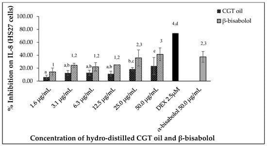 Effect of CGT oil and β-bisabolol dilutions on IL-8 production in HS27 cells. HS27 cells were exposed to test extracts or compounds for 1 h and then induced with 100 ng/mL lipopolysaccharide (LPS) for IL-8 production (n = 3). Values are expressed as mean ± SD. Duncan’s multiple range test between average IL-8 production across the different concentrations indicates that dissimilar letters/numerals denote a significant difference (p ≤ 0.05).