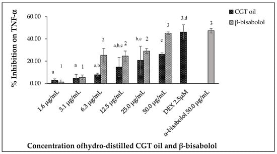 Tumor necrosis factor alpha (TNF-α) produced by LPS-stimulated RAW 264.7 macrophages was inhibited by different concentrations of CGT oil and β-bisabolol (Figure 8). CGT oil inhibited TNF-α production by up to 26.3%, whereas β-bisabolol inhibited TNF-α production up to 45.3%. This is close to the level of inhibition observed for the positive control of 2.5 µM (1.0 µg/mL) DEX. There was no significant difference (p > 0.05) in inhibitory activity of β-bisabolol (45.3%) and α-bisabolol (47.4%) at 50 µg/mL (Figure 8). The response of macrophage TNF-α production to CGT oil and β-bisabolol exposure was dose-dependent.