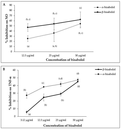 Effect of α-bisabolol and β-bisabolol dilutions on NO (A) and TNF-α (B) production in RAW 264.7 cells. RAW 264.7 cells were exposed to test extracts or compounds for 1 h and then induced with 100 ng/mL lipopolysaccharide (LPS) for NO and TNF-α production (n = 3). Values are expressed as mean ± SD. Duncan’s multiple range test between average TNF-α and NO production across the different concentrations indicates that dissimilar letters/numerals denote a significant difference (p ≤ 0.05).