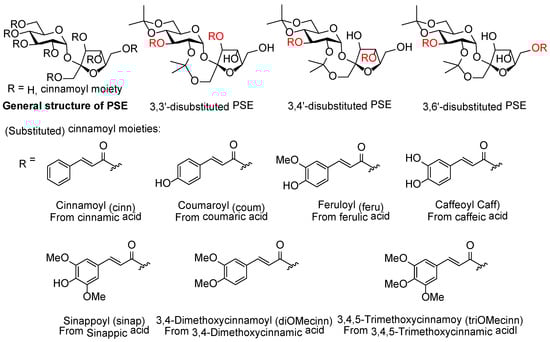The inhibition of α-glucosidase and α-amylase varies depending on the type and position of the (substituted) cinnamoyl moieties on the sucrose core (Figure 1) [1,2,3,15]. Therefore, the targeted 3,3′-, 3,4′-, and 3,6′-di-substituted PSEs are designed with commonly found (substituted) cinnamoyl moieties in natural PSEs, including cinnamoyl, coumaroyl, feruloyl, caffeoyl, sinapoyl, 3,4-dimethoxycinnamoyl, and 3,4,5-trimethoxy cinnamoyl moieties (Figure 1). The di-substituted PSEs are designed with di-isopropylidene bridges since they can have a beneficial effect through the reduction of α-amylase inhibition, which is believed to reduce GI side effects [12].