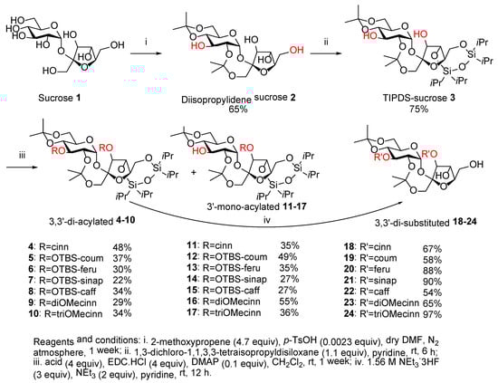 The synthesis of 3,3′-di-substituted PSEs began with the reaction of sucrose 1 with 2-methoxypropene to give di-isopropylidene sucrose 2 in 65% yield, following the process of Falkenhagen et al. (Scheme 1) with some modifications [16,17,18]. The dual protection of the 4′-OH and 6′-OH of di-isopropylidene 2 was accomplished using 1,3-dichloro-1,1,3,3-tetraisopropyldisiloxane to give TPDIS-sucrose 3 in 75% yield [19]. Subsequently, Steglich esterification of 3 with cinnamic acid, OTBS-coumaric acid, OTBS-ferulic acid, OTBS-sinapic acid, OTBS-caffeic acid, 3,4-dimethoxycinnamic acid, and 3,4,5-trimethoxycinnamic acid (Figure 1) gave the corresponding 3,3′-di-acylated products 4–10 in 22–48% yield, along with the 3′-mono-acylated counterparts 11–17 [12] in 27–49% yield (Scheme 1). The formation of 3′-mono-acylated compounds 11–17 is attributed to the higher nucleophilicity of 3′-OH in comparison to 3-OH [16,17]. Attempts to increase the yield of 3,3′-di-acylated products 4–10 by using higher equivalents of the acids and increasing the reaction time and temperature were unsuccessful. Finally, removal of the protecting TBS and/or TIPDS groups using NEt3.3HF gave the corresponding 3,3′-di-substituted PSEs 18–24 in 54–97% yield (Scheme 1).