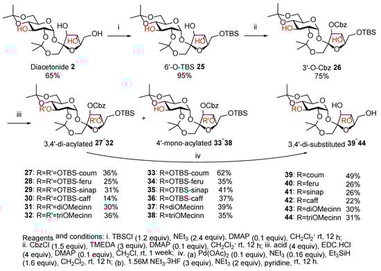 The precise synthesis of 3,4′-di-substituted PSEs is shown in Scheme 2. Since the primary 6′-OH of di-isopropylidene sucrose 2 is the most nucleophilic, it was protected first using tert-butyldimethylsilyl chloride (TBSCl); the reaction gave 6′-O-TBS 25 in 95% yield. Subsequent protection of 3′-OH with benzyl chloroformate (CbzCl) gave 3′-O-Cbz 26 in 75% yield. 3′-O-Cbz 26 was obtained as the major product since 3′-OH is the most reactive among the three OH groups of 6′-O-TBS 25 due to fewer steric effects. Next, Steglich reaction between 3′-O-Cbz 26 and cinnamic acid, OTBS-coumaric acid, OTBS-ferulic acid, OTBS-sinapic acid, OTBS-caffeic acid, 3,4-dimethoxycinnamic acid, and 3,4,5-trimethoxycinnamic acid gave the corresponding 3,4′-di-acylated products 27–32 in 14–36% yield, along with 4′-mono-acylated products 33–38 [12] in 35–62% yield, respectively (Scheme 2). Again, attempts to increase the yield of 3,4′-di-acylated products 27–32 by increasing the acid equivalents as well as the reaction temperature and time were unsuccessful. In this case, the 4′-OH proved to be more nucleophilic than the 3-OH, as indicated by the formation of 4′-mono-acylated products in high yield. Subsequently, removal of the Cbz protecting groups using Pd(OAc)2 and the TBS protecting groups using NEt3.3HF gave 3,4′-di-substituted PSEs 39–44 in 22–49% yields over two steps (Scheme 2).