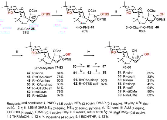 The synthesis of 3,6′-di-substituted PSEs began with protecting the 4′-OH group of 6′-O-TBS 25 with p-nitrobenzoyl chloride (PNBCl) to give 4′-OPNB 45 in 70% yield (Scheme 3). Removal of the TBS protecting group of 45 using NEt3.3HF gave compound 46. Subsequent Steglich reaction between compound 46 and cinnamic acid, acetyl-coumaric acid, acetyl-ferulic acid, acetyl-sinapic acid, OTBS-caffeic acid, 3,4-dimethoxycinnamic acid, and 3,4,5-trimethoxycinnamic acid gave the corresponding 3,6′-di-acylated compounds 47–53 in 66–79% yield, along with traces of other compounds thought to be the mono-acylated counterparts. In this case, the yields were much higher in comparison to 3,3′- and 3,4′-di-acylated compounds due to higher nucleophilicity and less steric hindrance of the primary 6′-OH. We purposely protected coumaric, ferulic, and sinapic acids with acetyl groups rather than the usual TBS since these groups can be removed simultaneously in one step during the removal of the Cbz and PNB groups using Mg(OMe)2. Acetylation of caffeic acid posed problems, so in this case, OTBS-caffeic acid was used. Finally, simultaneous removal of the Cbz, PNB, and acetyl groups of 47–49, 52 and 53 with Mg(OMe)2 gave 3,6′-di-substituted PSEs 54–56, 59, and 60 in 21–90% yield, respectively (Scheme 3). During the reactions, TLC showed two to three spots indicating stepwise deprotection; the reaction was deemed complete when only one spot was observed. However, while Mg(OMe)2 removed the Cbz and PNB groups of 3,6′-diacylated 50, it failed to remove its acetyl group and gave compound 61 in 53% yield. Piperidine successfully removed the acetyl group of compound 61 to give the required 3,6′-di-substituted PSE 57 in 45% yield. In the case of 3,6′-diacylated 51, Cbz and PNB groups were removed using Mg(OMe)2 to give compound 62 in 82% yield, which upon removal of its TBS groups using NEt3.3HF gave 3,6′-di-substituted PSE 58 in 94% yield (Scheme 3). Copies of the [1] H NMR, [13] C [1] NMR, and 2D NMR spectra of the synthesized compounds are available online (Supplementary Materials).
