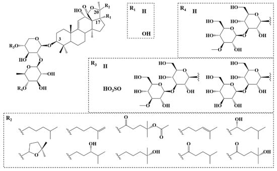 General structure of the Holothuria scabra saponins [17] containing a holostanol aglycone with different side groups, including a C3-anchored glycan presenting a sulfate group on the first monosaccharidic unit.