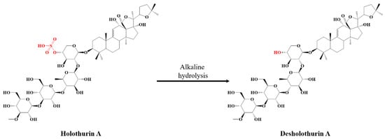 Selectively removing the sulfate group of the H. scabra saponins could contribute to validate the hypothetical role of the sulfate group present on these defensive chemicals. Bedini et al., when reviewing the different chemical methods to chemically modify polysaccharides, reported that the efficient desulfation of saccharides may be induced by heating to 80–100 °C in 0.1 M of NaOH aqueous solutions [45].