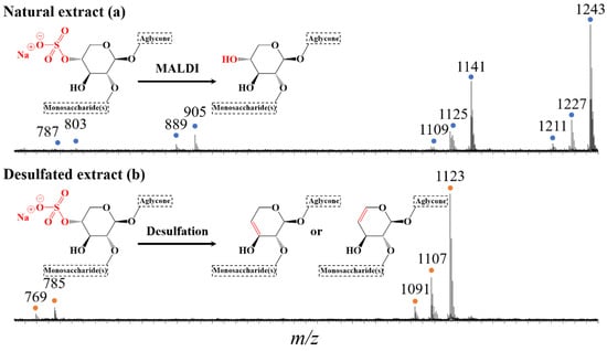 Mass spectrometry analysis of two different saponin extracts: (a) the purified saponin extract with detection of sulfated 4-sugar saponin ions, desulfated 4-sugar saponin ions, sulfated 2-sugar saponin ions and desulfated 2-sugar saponin ions; and (b) the microwave-assisted alkaline desulfation (pH 14—100 °C—5 min) reaction products with 4-sugar desulfated saponin ions and 2-sugar desulfated saponin ions.