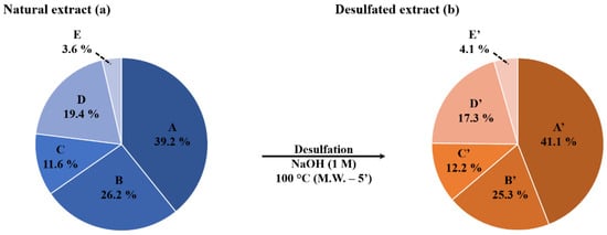 Using LC-MS analysis, we confirmed that the microwave-assisted desulfation of the saponins is quantitative for all the different saponin congeners present in the natural extract, since the 5 saponin elemental compositions (A–E in Table 1) are now detected as their desulfated counterparts, identified as A’ to E’ in Table 2, with molar fractions that are mostly unaffected by the microwave treatment, see also Figure 4 for the graphical comparison. Moreover, note that, for each elemental composition, different isomers are detected with molar proportions that are marginally affected by the microwave treatment, see Table 1 and Table 2.