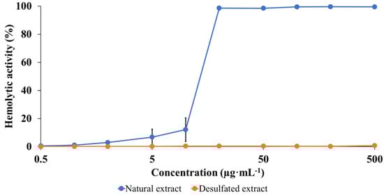 The data presented in Figure 6 immediately confirm that the sulfate group plays a crucial role in the membranolytic activity of H. scabra saponins. Indeed, we note that the desulfated saponins remain inactive, even at a concentration of 500 µg·mL−1 that corresponds to the solubility limit of the saponins in the red blood cell suspension. On the contrary, the natural saponins start to be active against red blood cells already at 1 µg·mL−1, and the 540 nm absorbance steadily increases with increasing saponin concentration.