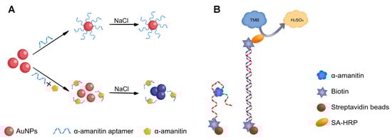 Experimental schematic. (A) Schematic illustration of the affinity of the α-amanitin truncated aptamer by colloidal gold spectrophotometry. (B) Schematic illustration based on MELISA to detect α-amanitin.