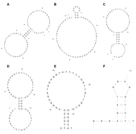 Secondary structures of the original α-amanitin aptamer and the truncated aptamer. The secondary structures of the aptamers were predicted and analyzed using Mfold software. (A–F) are Apt, Apt-2, Apt-8, Apt-10, Apt-11, and Apt-12.