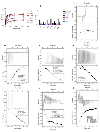 Haracterization of the α-amanitin aptamer and truncated aptamer. (A) Determining α-amanitin aptamer and truncated aptamer affinity. The aptamer concentrations (0, 50, 100, 200, 400, 800, and 1600 nM) were combined with equal amounts of α-amanitin (1 μg/mL), and the Kd values were analyzed by non-linear regression analysis using GraphPad Prism 8 software. (B) Specific test of aptamers with α-amanitin and other non-targets (β-amanitin, DON, AFB1, FB1, OTA). (C) Blank control: ITC results for titration of α-amanitin with ultrapure water. (D–I) ITC results of aptamer titration of α-amanitin.