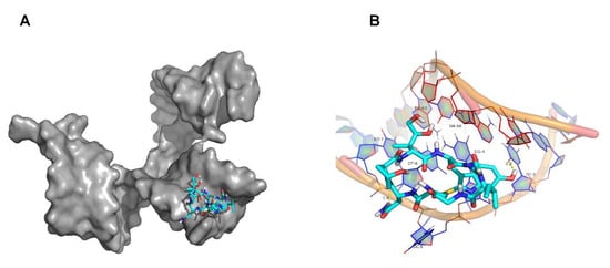 The interactive mechanism between the aptamer and α-amanitin was investigated by the molecular docking simulation technique. (A) Schematic diagram of α-amanitin binding to the aptamer (autodock mapping). (B) Base sites of the interaction between α-amanitin and the aptamer (pymol mapping).