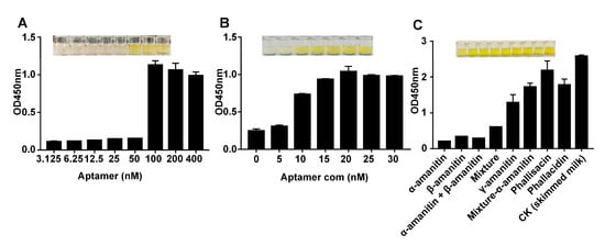 Determining the optimal concentration of the aptamer was a key part of this experiment, as too low an aptamer concentration would lead to insignificant changes in absorbance values, and too high an aptamer concentration would lead to higher costs. First, the magnetic beads were cleaned twice with a magnetic bead combined buffer, and the volume in each tube after the last cleaning was 50 μL. The magnetic beads were resuscitated with a fit combination buffer of 3.125, 6.25, 12.5, 25, 50, 100, 200, and 400 nM, respectively, and gently shaken at room temperature for 15 min. The supernatant was discarded from the coupling-adapted streptavidin magnetic beads in the 1.5 mL centrifuge tube. Skim milk was added at 37 °C, and the tubes were closed for 2 h. A 100 μL aliquot of α-amanitin (final concentration of 500 ng/mL) was added to each tube and incubated at 37 °C for 2 h. A 100 μL aliquot of the aptamer-labeled complementary chain (20 nM) with a biotin label was added and incubated for 1 h at 37 °C. A 100 µL portion of 1000-fold diluted HRP was added to each tube and incubated at 37 °C for 1 h. The tubes were washed four times with PBST solution, after each of the above steps. A 100 μL aliquot of TMB color development solution was added and incubated at 37 °C for 15 min in the dark. After color development was completed, 50 μL of 2 M H2SO4 was added to each tube to terminate the reaction, and the supernatant was aspirated. The absorbance value of the supernatant solution was measured at 450 nm within 10 min of terminating the reaction using an enzyme marker.