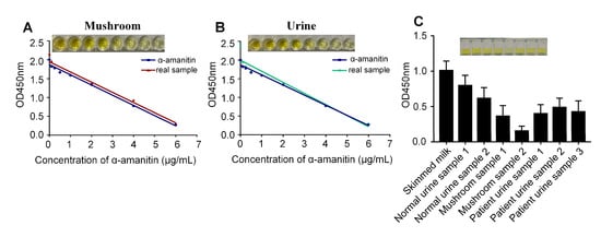 Experimental method validation. (A) Sensitivity detection. The concentrations of α-amanitin in standard and mushroom were 0, 0.1, 0.25, 0.5, 1, 2, 4, and 6 μg/mL, and the corresponding OD450 values were used to prepare the standard curve. Standard curve of α-amanitin in mushroom: y = −0.2701x + 1.945(R2 = 0.969). (B) The concentrations of α-amanitin in standard and urine were 0, 0.1, 0.25, 0.5, 1, 2, 4, and 6 μg/mL, and the corresponding OD450 values were used to prepare the standard curve. Standard curve of α-amanitin in urine: y = −0.2969x + 1.996(R2 = 0.94). (C) Determination of α-amanitin in the actual samples. Samples (mushroom leachate and urine) were tested with skim milk as a blank control.