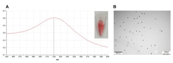 Characterization of colloidal gold. (A) UV-visible absorption spectra of the AuNPs. (B) TEM image of the AuNPs.